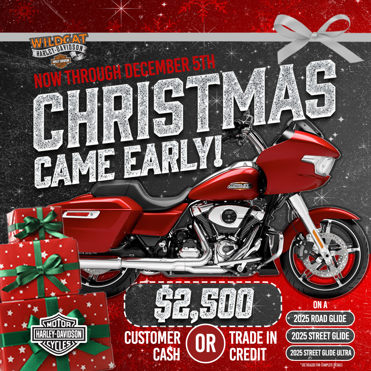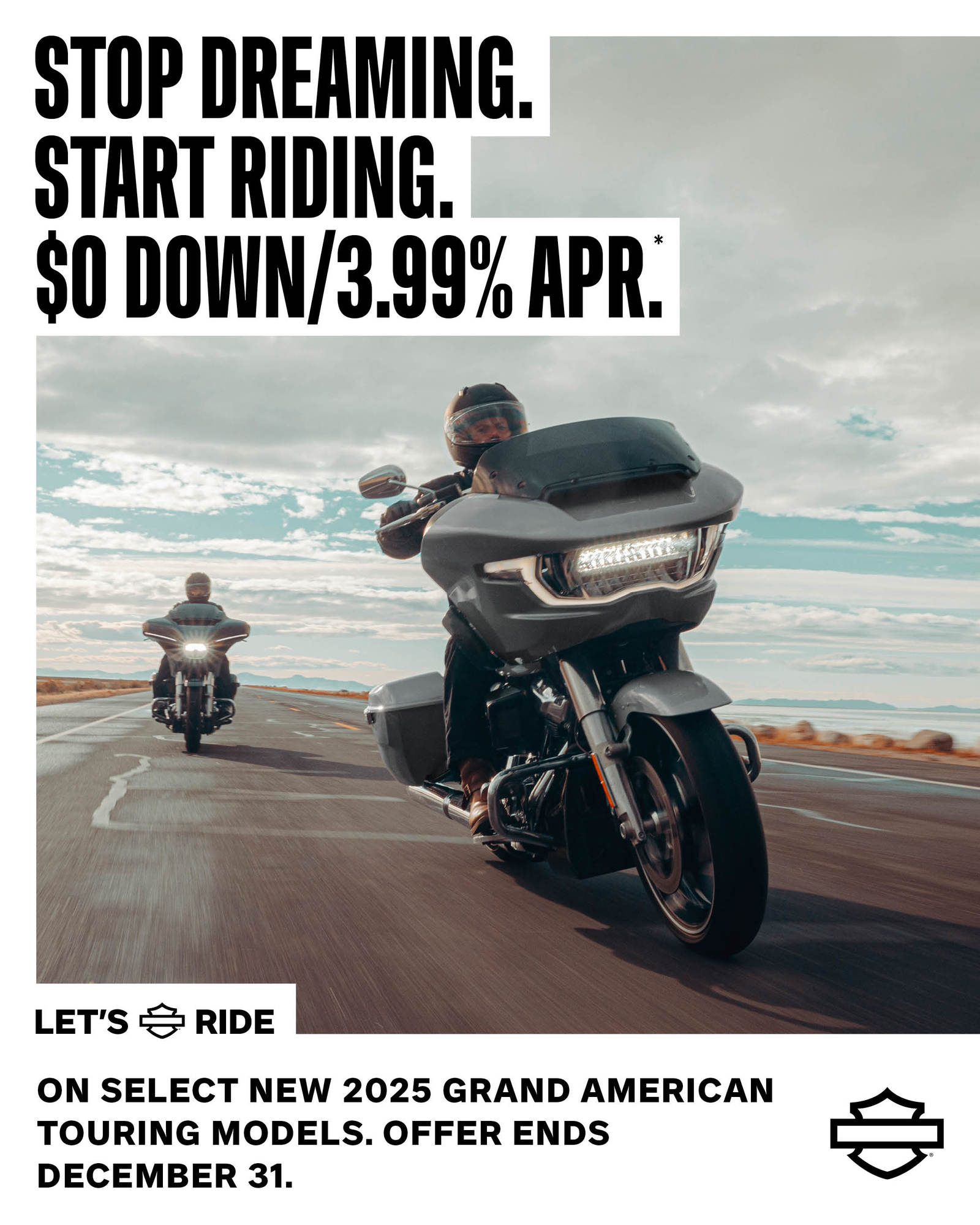 *Financing Offer available only on select, new untitled 2025 Road King® Special, Street Glide®, Street Glide® Ultra and Road Glide® Harley-Davidson® motorcycles financed through Eaglemark Savings Bank and is subject to credit approval. Harley-Davidson® CVO™ motorcycles are excluded. Not all applicants will qualify as the Annual Percentage Rate (APR) will vary based on the applicant’s past credit performance and the term of the loan. Financing offer is available only for up to a 36-month term. For example, a 2025 Road Glide motorcycle in Billiard Gray with Chrome trim and an MSRP of $27,999, no down payment and amount financed of $27,999, 36-month repayment term, and 3.99% APR results in monthly payments of $826.52. In this example, customer is responsible for applicable taxes, title, licensing fees and any other fees or charges at the time of sale. APR is calculated according to the simple interest method. Not valid in conjunction with other offers. Customer must take delivery by December 31, 2025. This Financing Offer is valid during the period of November 1, 2025 to December 31, 2025. Other terms, conditions, and limitations may apply. Dealer participation may vary. Financing offer is subject to change or cancellation at anytime. See dealer for details.