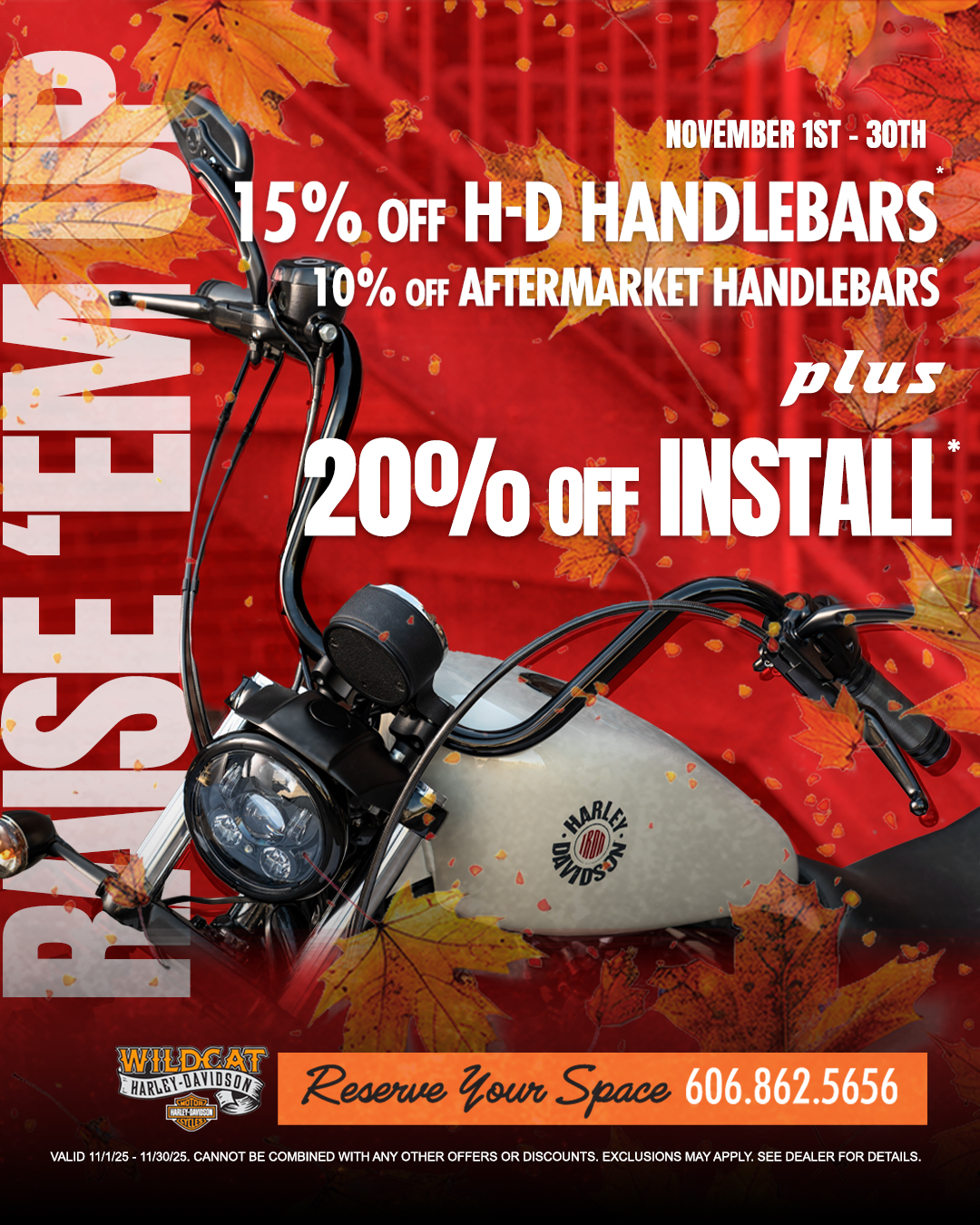 15% Off H-D Handlebars + 20% Off InstallGet 15% off H-D handlebars, 10% off aftermarket handlebars, & 20% off install!